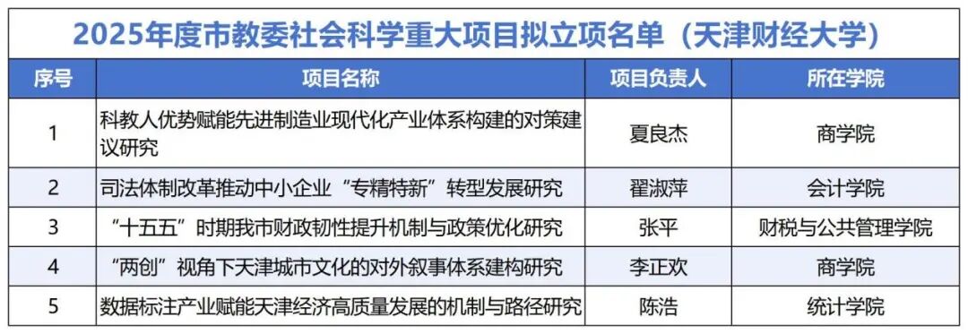 此次拟立项的5个项目,主要围绕经济现代化、产业创新、法治改革、文化传播与财政韧性等方向展开,涉及天津“制造业立市”“专精特新”发展、财政能力提升、城市文化国际传播、数字经济赋能等领域。项目内容结合天津市发展实际,注重问题分析与对策研究,展现出我校在服务地方经济社会发展方面的持续努力。